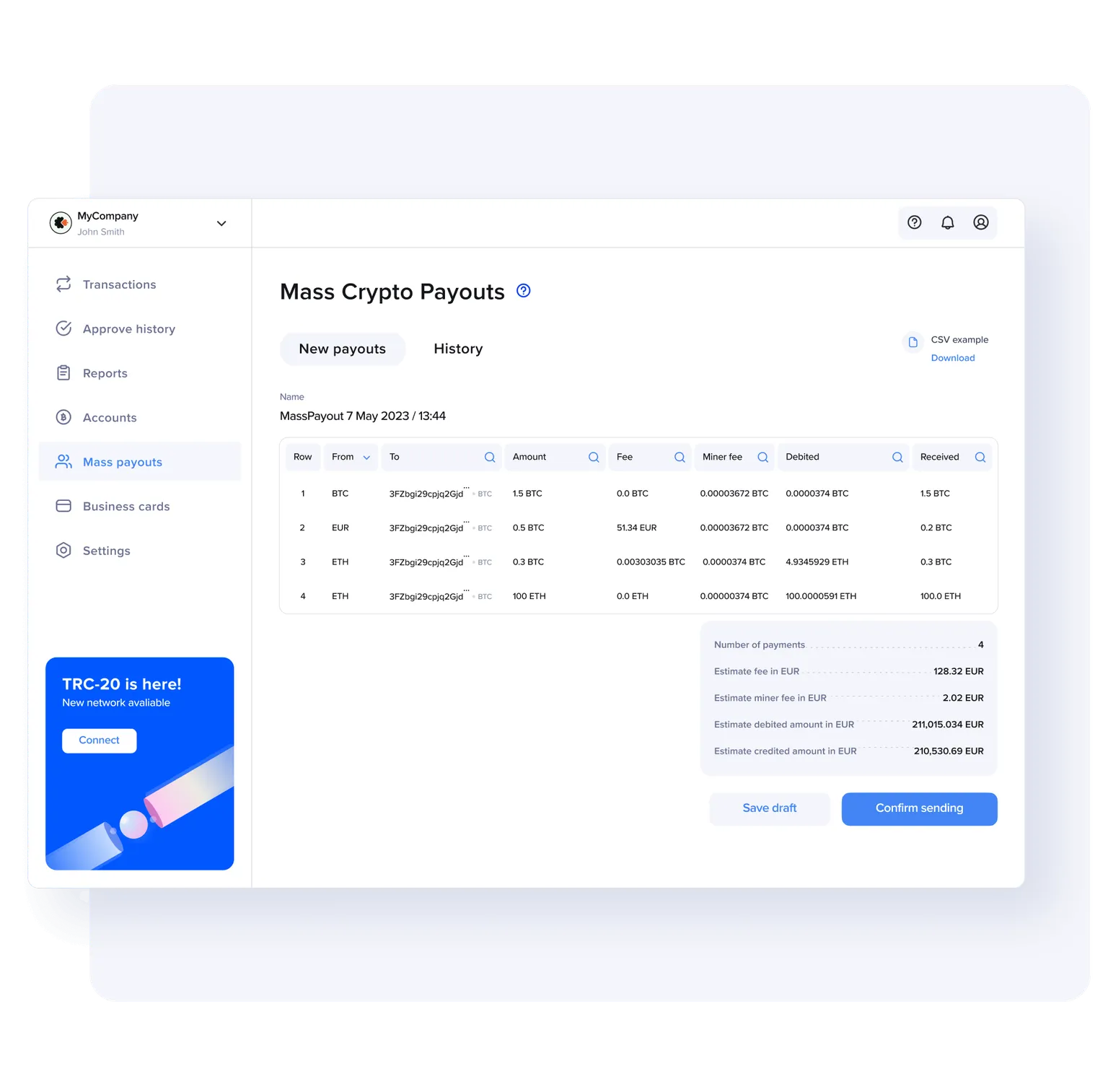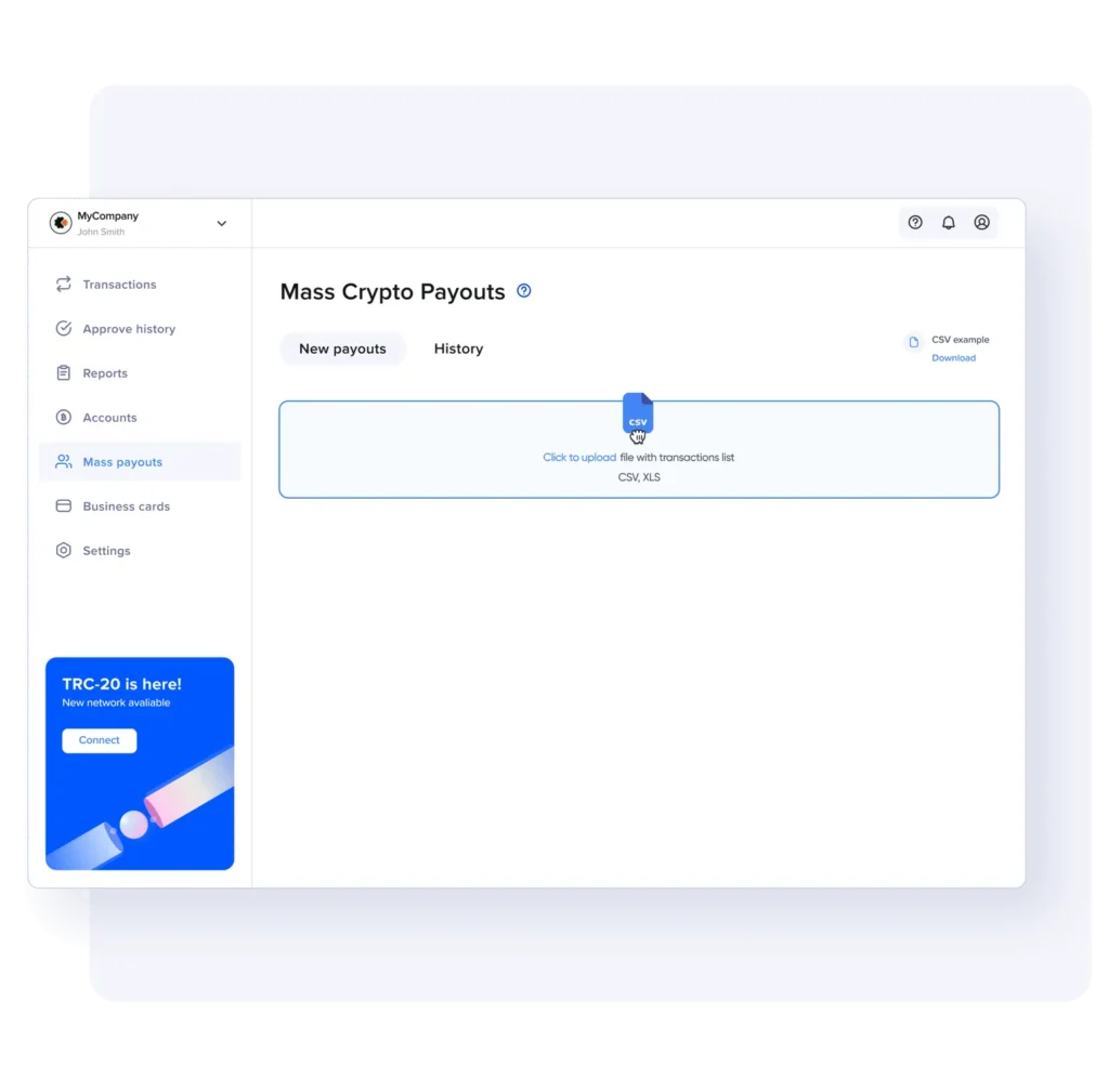 You don’t need any tech knowledge or complex integration – just a simple CSV file with addresses and amounts