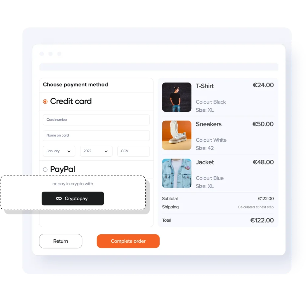 Attract the customers who prefer paying in crypto. Integrate a ready-made payment page in a few clicks, accept crypto and get paid in cash